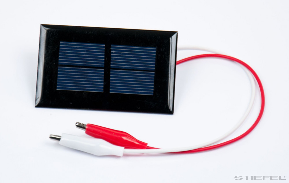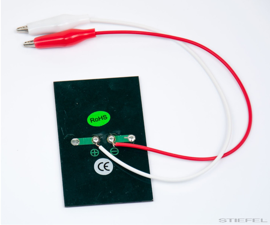 Pentru experimente pe tema fotovoltaicelor și tehnologiei solare, pentru conversia directă a energiei radiante (lumina solară) în energie electrică; Celulă solară policristalină cu suprafață etanșată, două cabluri de conexiune cu cleme tip crocodil, trasee de cupru pe partea din spate pentru lipire, poli marcați.