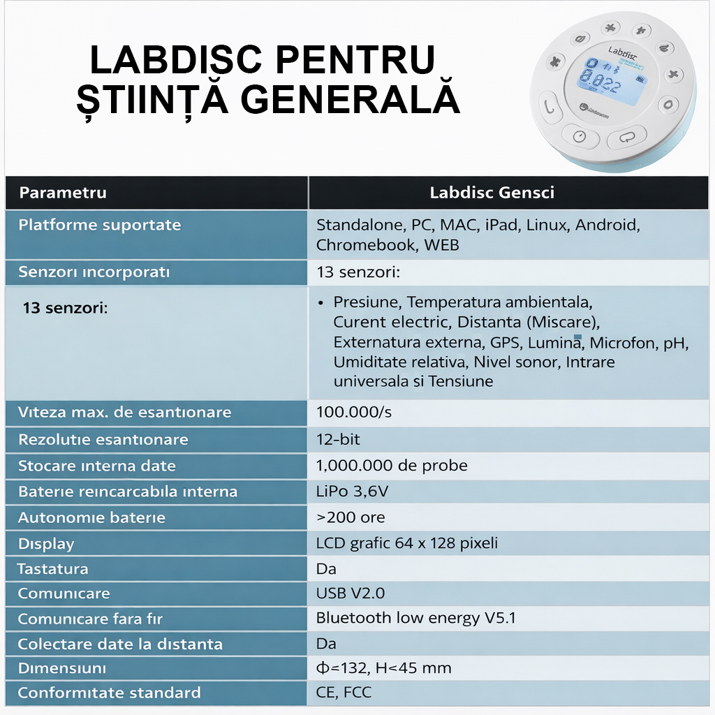 Labdisc Gensci este un data logger educațional multifuncțional, conceput pentru predarea și experimentarea practică a științelor reale: fizică, chimie, biologie și știința mediului. Datorită celor 13 senzori integrați, dispozitivul permite realizarea de experimente interdisciplinare fără echipamente suplimentare. Compact, ușor și robust, Labdisc Gensci este ideal pentru școli, licee, universități și laboratoare educaționale, oferind elevilor și profesorilor acces la măsurători reale și date precise.