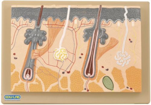 Modelul prezintă cele trei straturi ale pielii și structuri interne pentru examinare detaliată inclusiv glandele sebacee și sudoripare foliculii de păr mușchii piloerectori arterele nervii și venele